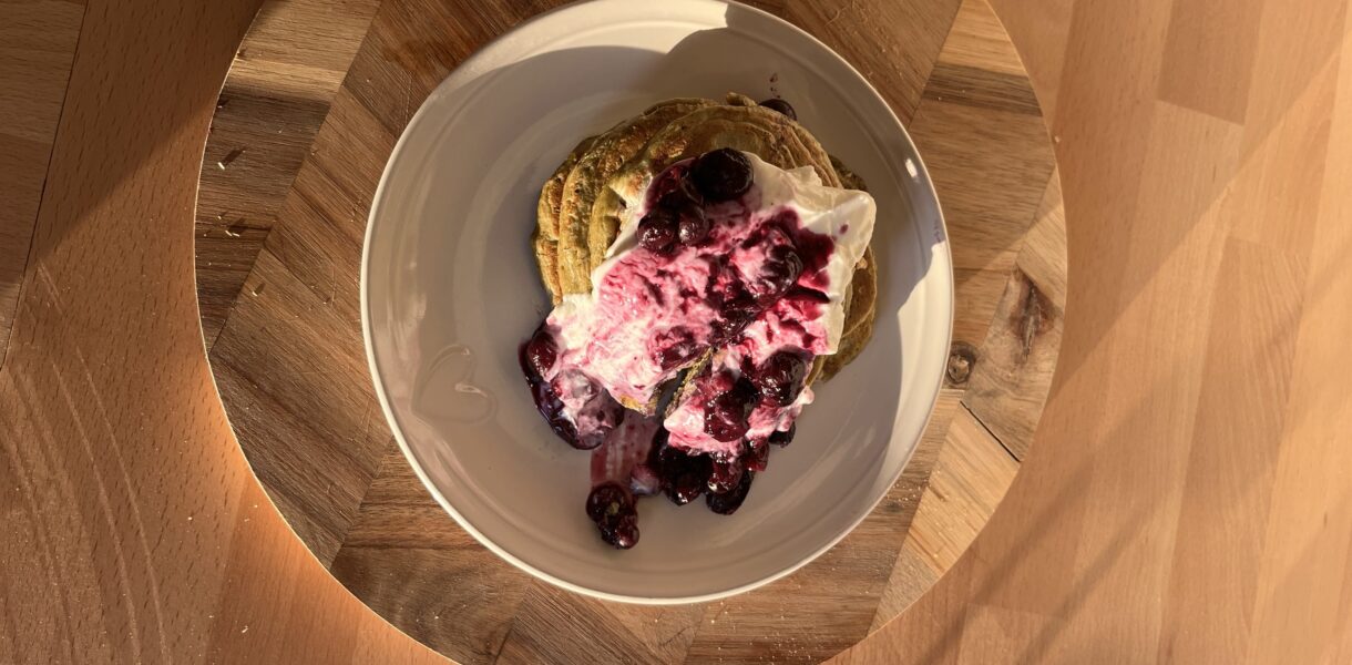 - Stack the pancakes on a plate, spoon the mashed blueberries over the top, and finish with a dollop of Greek yoghurt. Serve immediately and enjoy!